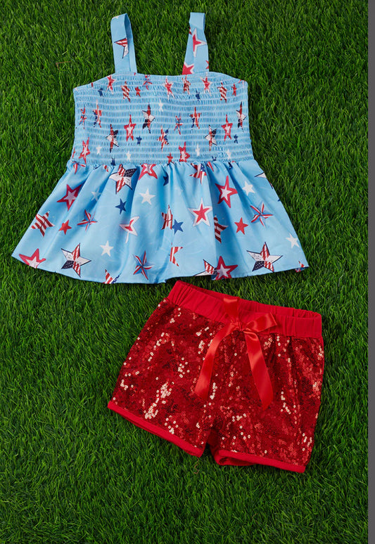 PATRIOTIC PRINTED RUFFLE TANK TOP & SEQUINS BOTTOMS.