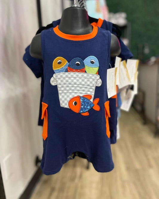 Navy fish applique pocket boy romper