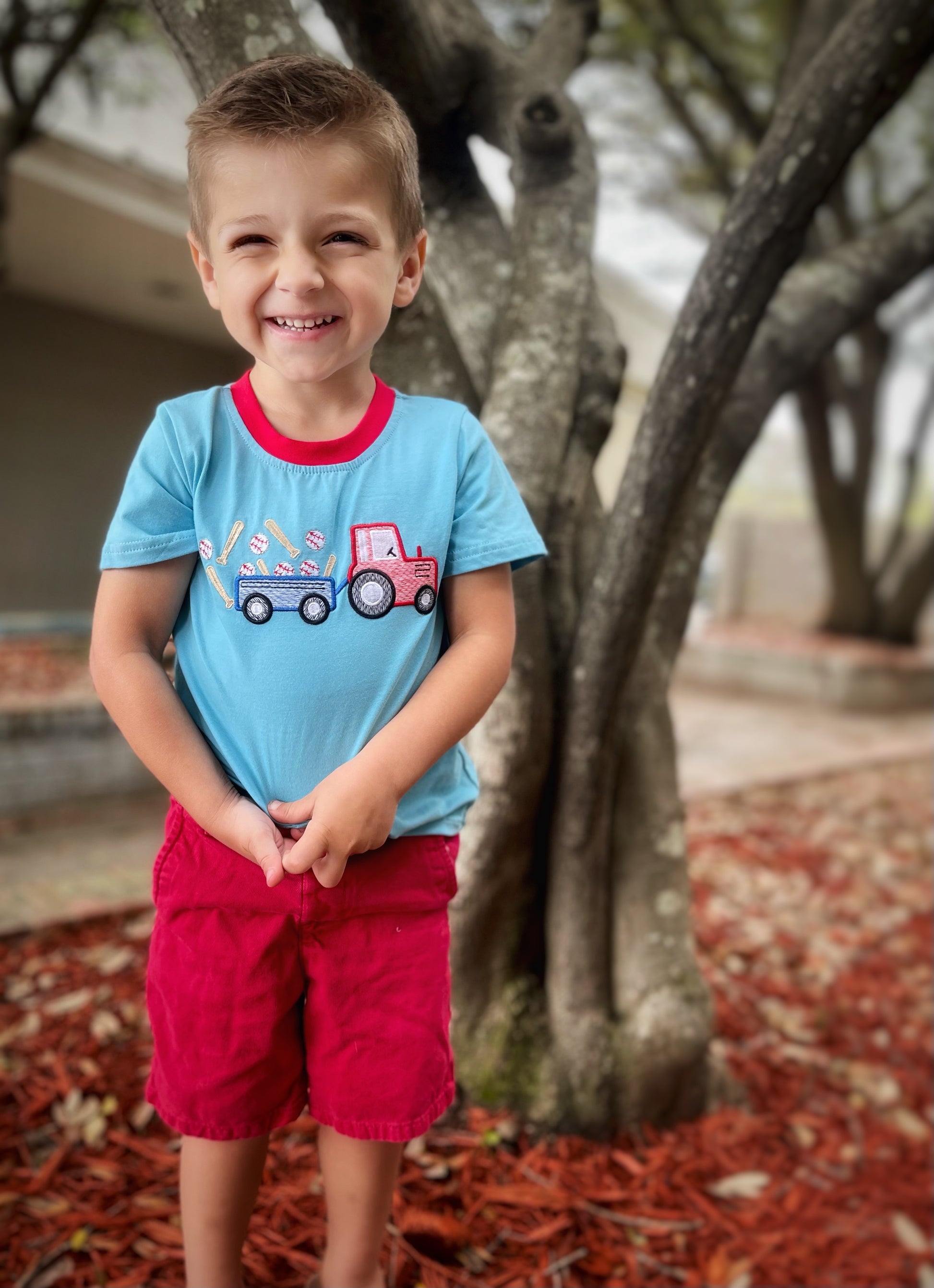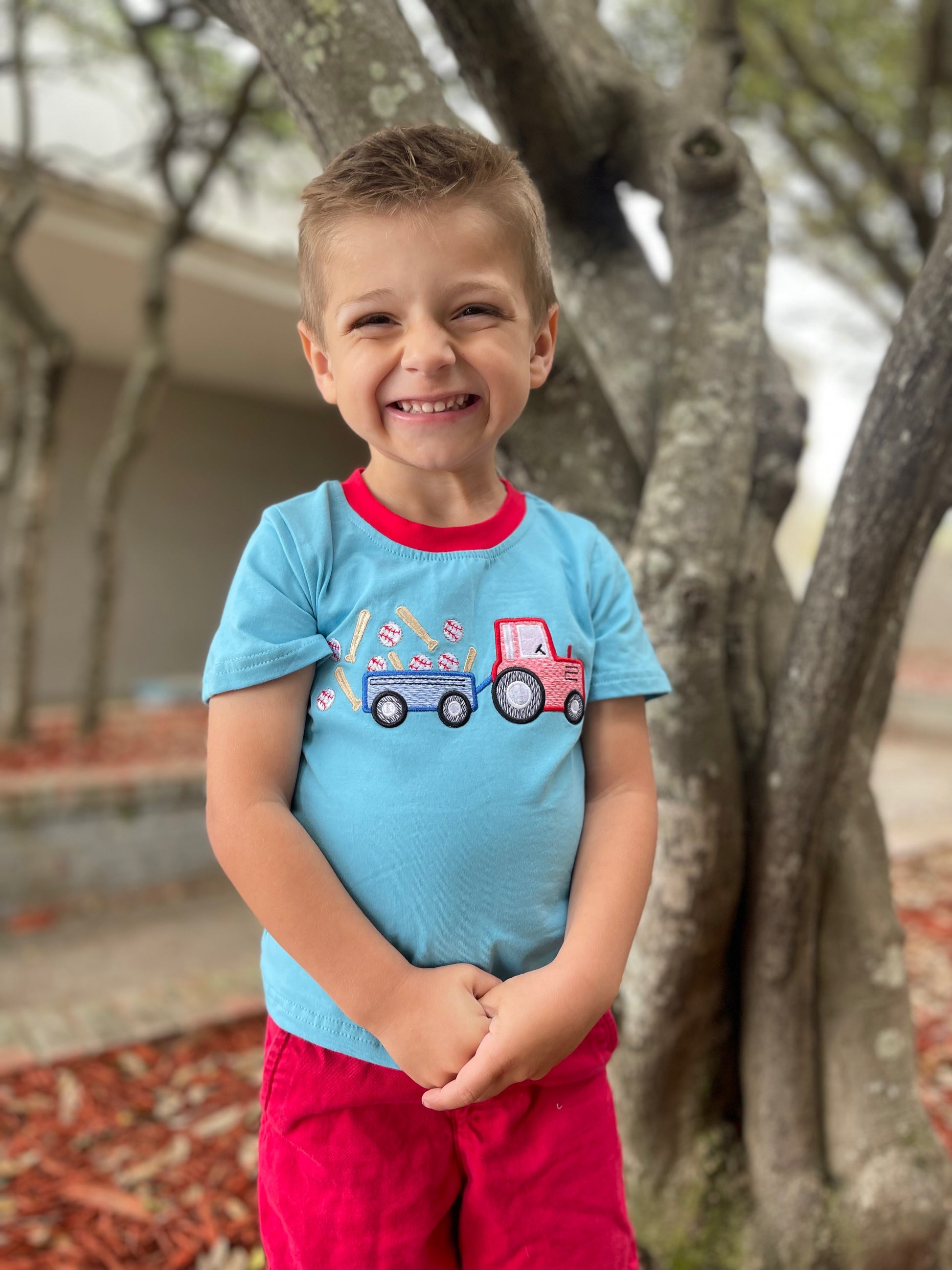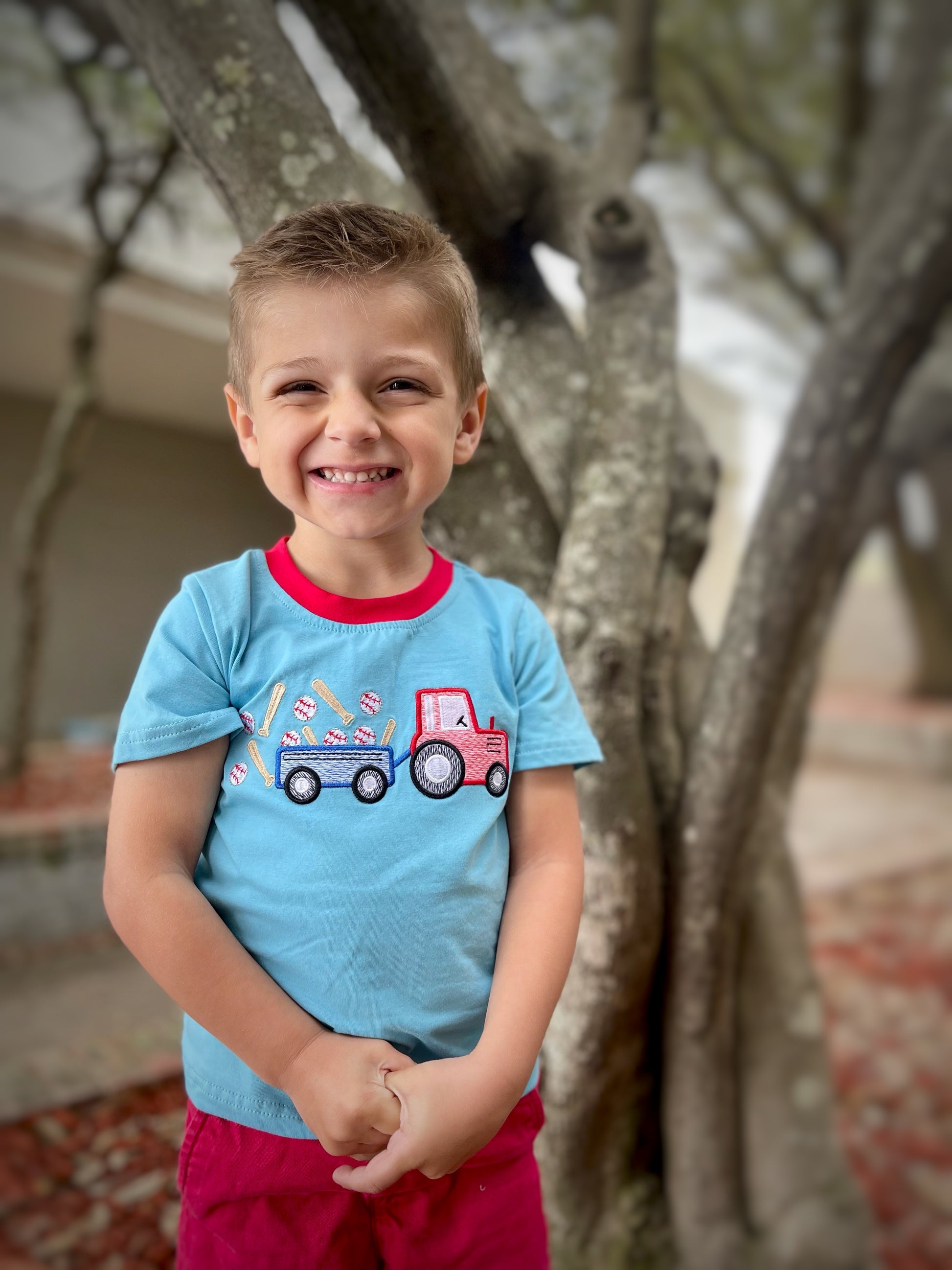 Welcome the Baseball season with this Blue truck baseball appliqué boy top! With this top, your little one will be ready to set play and show off his team spirit. Crafted out of breathable fabric and featuring an adorable Blue truck appliqué, this shirt is perfect for a walk in the park or a game of catch. 97% Cotton 3%Spandex