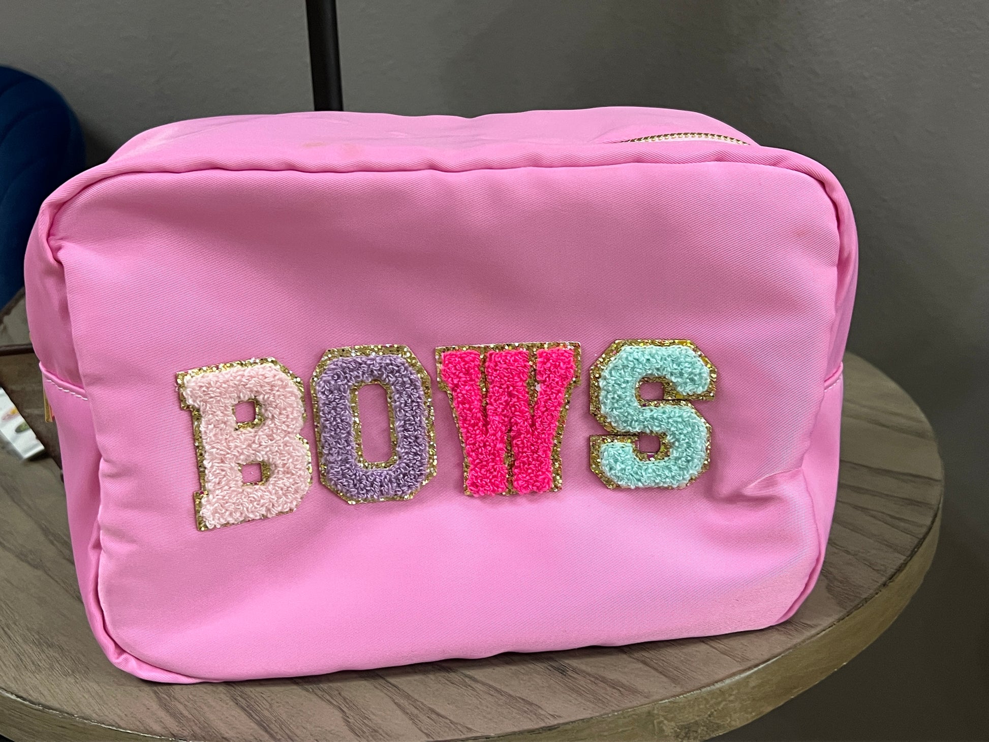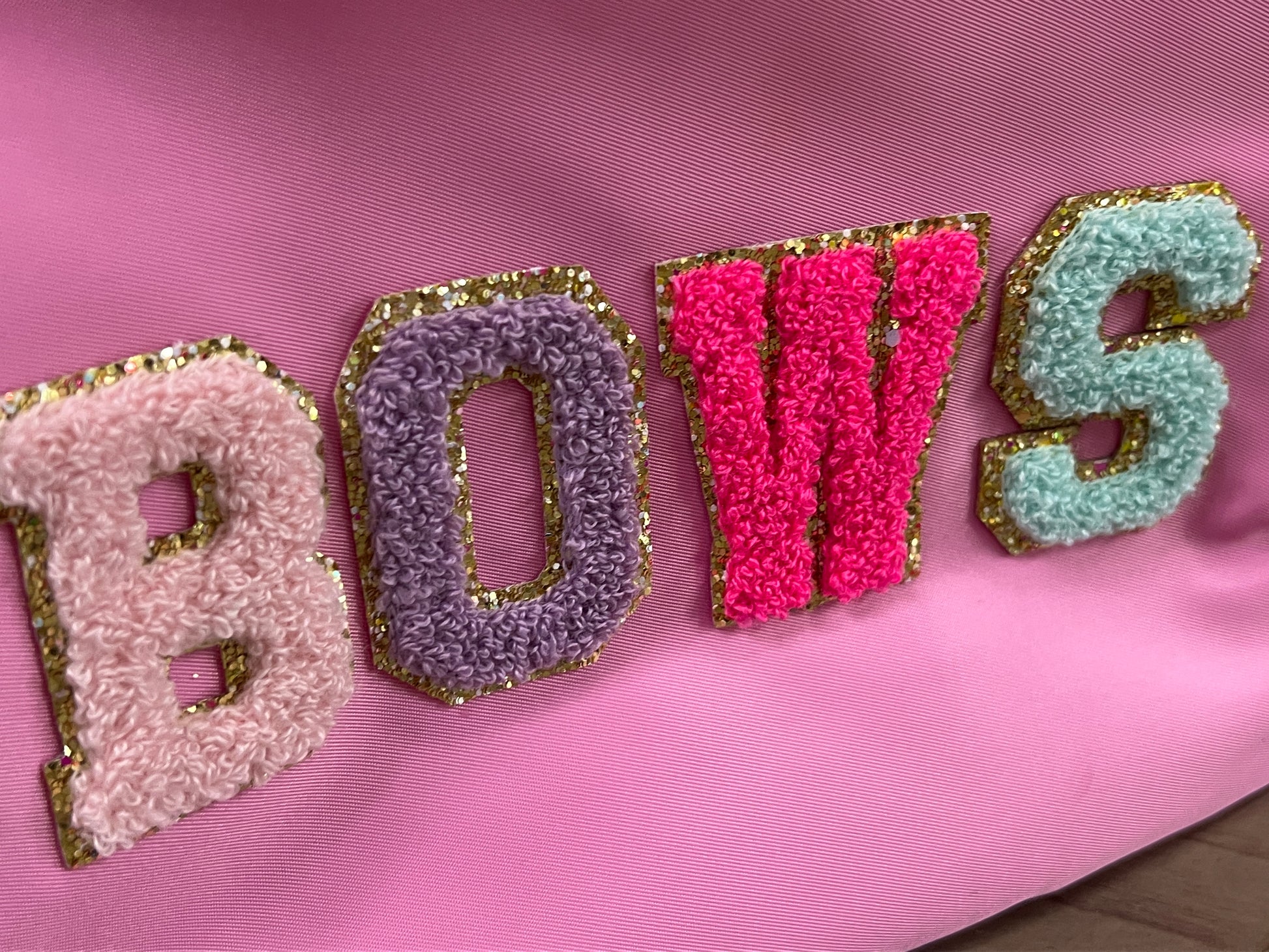 This adorable and popular chenille lettering bag is the perfect way to keep all your bows in one place. Whether you're a bow afficianado or just looking for a way to organize your supplies, this bag is perfect for you. With enough room to store all your bows, it's the perfect item to take for your next trip.