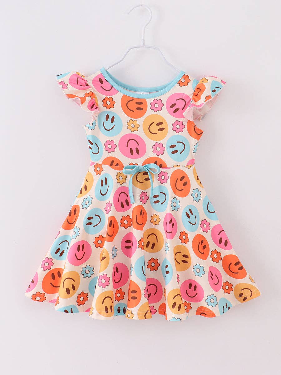 Emoji Smile Ruffle Girl Dress 95% Polyester, 5% Spandex The 'milk silk' feel of the material is a blend of Cotton/Polyester/spandex. The pattern is referred to as "milk silk" a super soft, comfortable, buttery feel material- you will fall in love! Care instructions: Cold wash, gentle cycle, hang dry or tumble dry low inside out, do not bleach, do not iron.