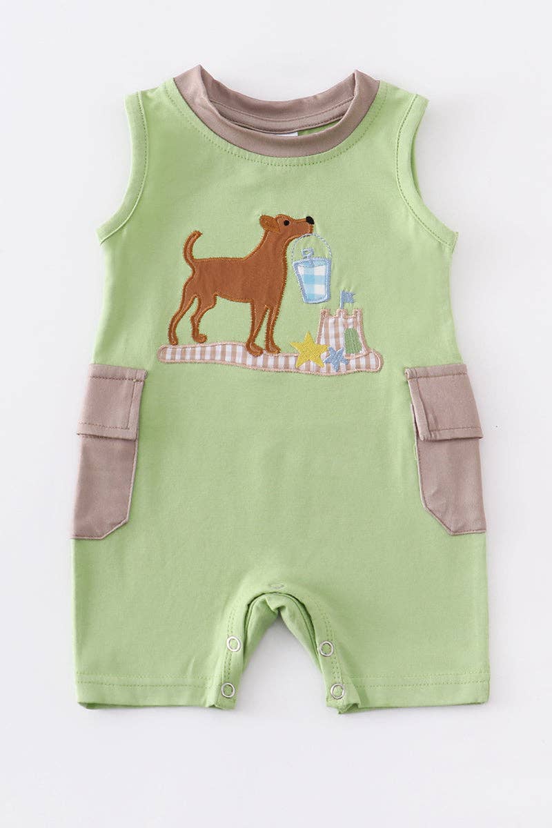 Green dog applique pocket boy romper