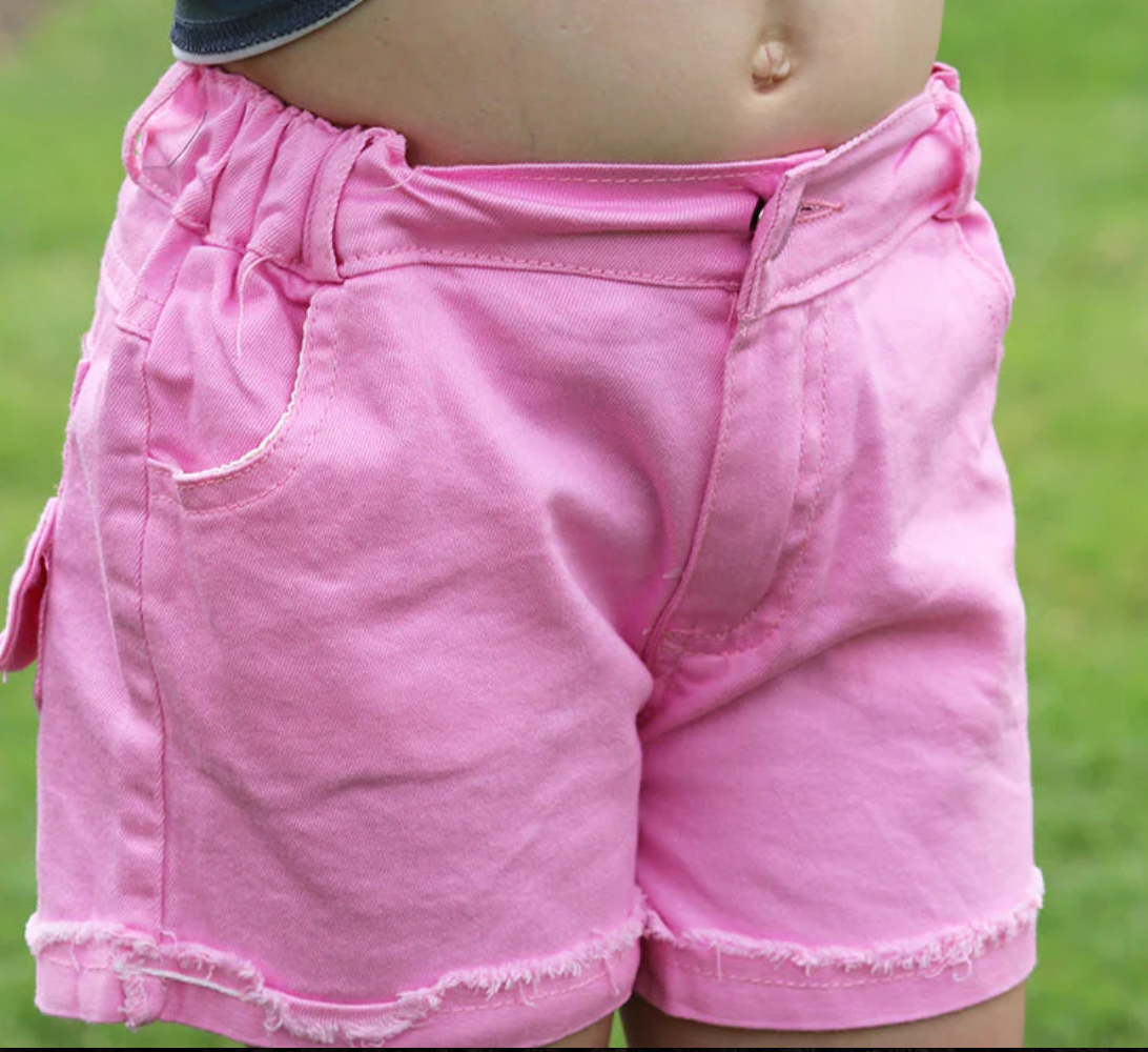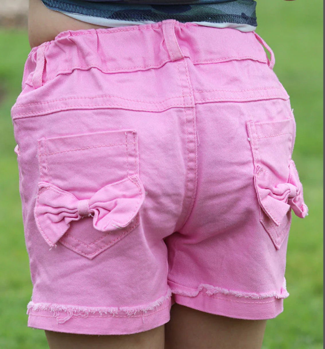 Pink denim shorts with bow detail on back