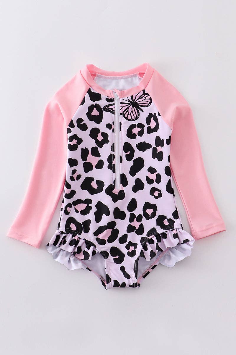 Pink leopard butterfly ruffle girl swimsuit